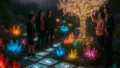 宇多和町の広場で、雲のランタンを見上げる住民たちのひととき。